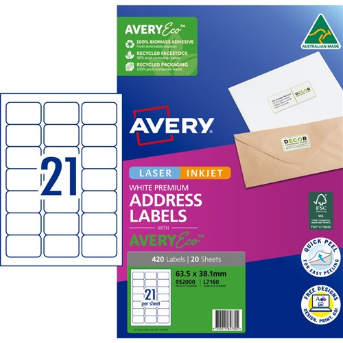 Avery Premium Address Labels White Laser Inkjet AveryEco L7160 63.5x38.1mm 21UP 420 Lab
