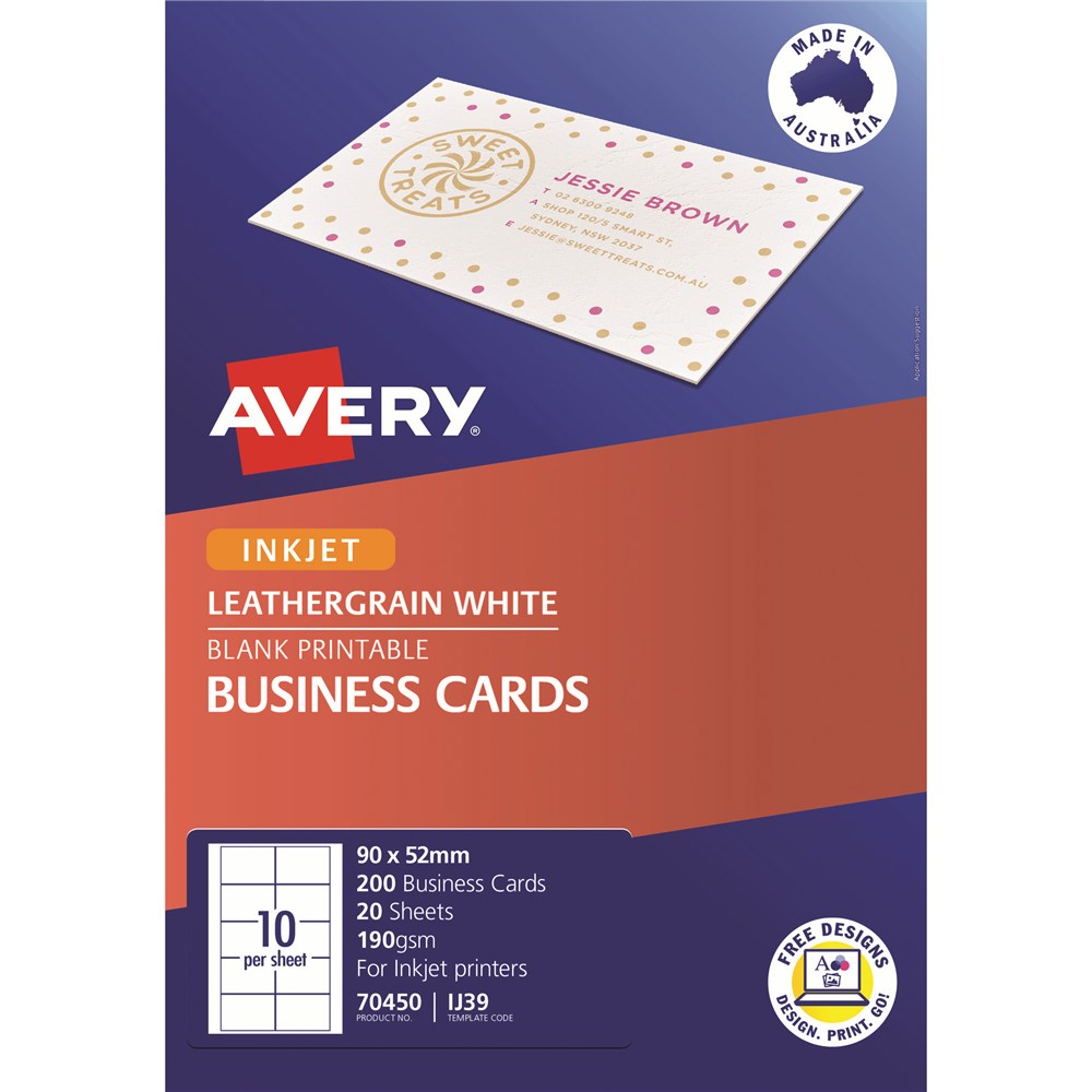 Create custom business cards instantly using your printer. Made of high quality card stock and can be printed in black or colour. Save time as cards are instantly available. Customise your labels with Avery Design and Print, available at averyproducts.com.au/print. Size: 90x52mm 200 cards, 20 sheets. 10 cards per sheet (10UP).