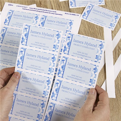 Durable heavy weight material to ensure you make the right impression. Matte coating. Quick & Clean separates easily with smooth and clean edges. Cards are instantly available, saving you time. Save money by only printing the number of cards you need. Customise your labels with Avery Design and Print, available at averyproducts.com.au/print. Size: 85 x 54 mm 250 Cards, 25 Sheets. 10 cards per sheet (10UP).