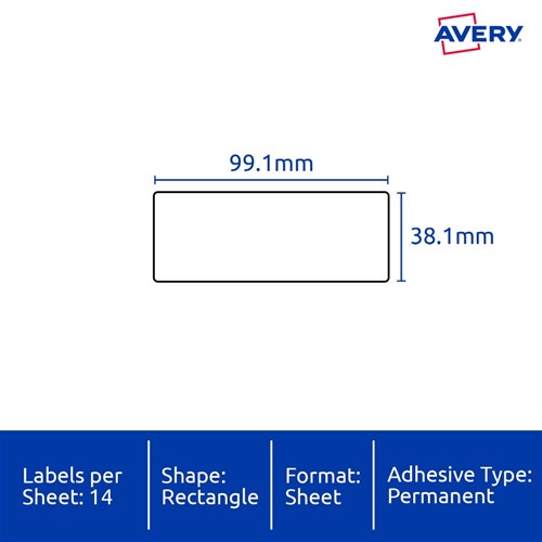 Heavy duty, waterproof, UV, oil and tear resistant unaffected by temperatures between -20°C to 80°C. Ideal for labelling equipment and organising property. Engineered to take on tough applications where a standard label is not fit for purpose. Customise your labels with Avery Design and Print, available at averyproducts.com.au/print. Made in Australia. Size: 99.1x38.1mm 350 labels, 25 sheets. 14 labels per sheet (14UP).