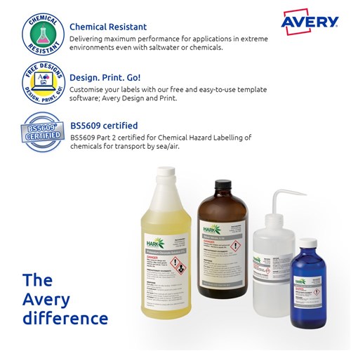 Ultra-Resistant Labels are saltwater resistant and certified for GHS Chemical Labelling with permanent adhesive and engineered to take on harsh environments. Unaffected by temperature variations -40?C to +150?C. Ideal for chemical labelling requirements and for onsite chemical decanting. Used in marine and harsh environments, ideal for safety signs, arc flash and tanks. Customise your labels with Avery Design and Print, available at averyproducts.com.au/print. Size: 99.1x67.7mm 80 labels, 10 sheets. 8 labels per sheet (8UP).
