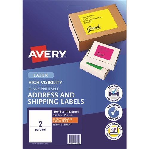 Avery High Visibility Shipping Laser Labels Orange L7168FO 199.6x143.5mm 2UP 20 Labels