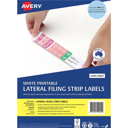 Avery Lateral Filing Laser & Inkjet Labels White L7174 42x200mm 400 Labels 100 Sheets