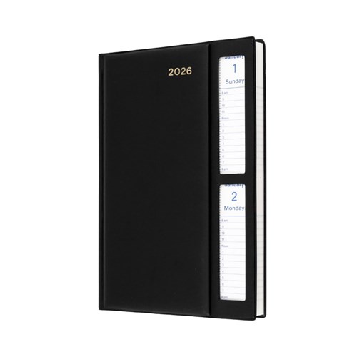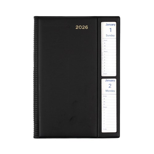 Bound in a highly durable, welded PVC padded cover. Printed on white paper, week numbers and Julian days. Features ribbon marker 2 days to a page layout plus window. Includes a tear-out appointment time section, as well as a clear window to enable the current day to be seen at a glance. Appointment times from 8am - 8pm hourly. Australian and New Zealand Holidays. 3 year calendars. Current and forward year planners. International dialling and time zones. Staff leave planner. Addresses and notes. Size: 210 x 148mm. FSC Certified.