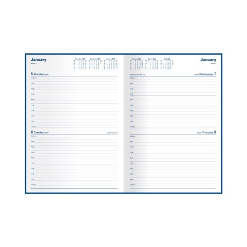 Hardwearing, linen-look cover. Extensive range of internal features, including notes, planners and essential information. Lay flat opening, ribbon marker, 2 days to a page layout. Appointment times from 8am -5pm hourly. Australian and New Zealand holidays. 3 year calendars. Current and forward year planners. Monthly planners, addresses and notes. Tax information, staff leave and financial summary. International holidays and International dialling. Size: 297 x 210mm. FSC Certified.
