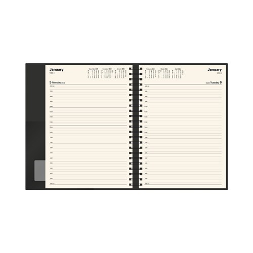 The best selling Vanessa Diary is the diary of choice for astute professionals. Its durability is assured with double wire binding and heavy-grained metallic and matt PU cover. Printed on a subtle cream paper, each dated page layout features a six-month to opening calendar, week numbers, Julian days, as well as both national and international public holidays. Internal storage pocket, addresses and notes. Pen loop, lay flat opening, ribbon marker, day to page layout. Appointment times from 8am - 6pm 1/2 hourly. Staff leave and financial summary. 3 Year calendars, Current and forward year planners. International dialling and time zone map. Size: 297 x 210mm. FSC Certified.