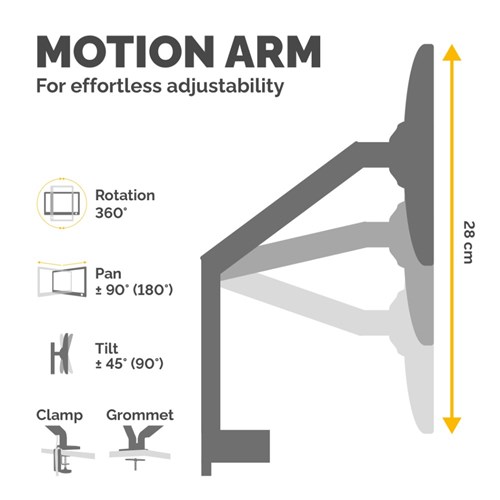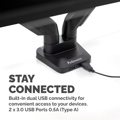 Fully independent adjustable monitor arms, with 360 degrees rotation via innovative gas spring technology allowing for effortless movement. Easily mounted via clamp or grommet, each arm holds a monitor up to 8kg (up to 40 inch monitors) and meets VESA mounting standards. Maximum width (from the centres of each monitor mount): 850.9mm. Maximum reach depth (from base towards the user): 495.3mm. 2 x 3.0 USB ports 0.5A (Type A0) built-in located at the base of the product makes it easy to connect your favourite devices. Intuitive cable management system helps minimise clutter. VESA 75 x 75 and 100 x 100 compliant. Specifications: 90 degrees tilt, 180 degrees pan, 360 degrees rotation. 5 Year Manufacturer's Warranty.