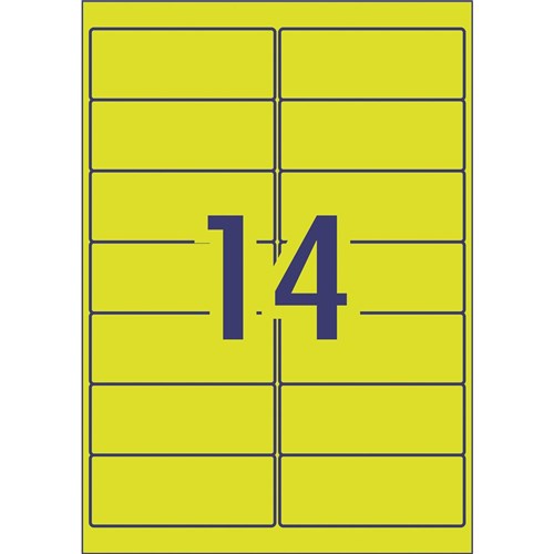 Ideal for labelling products, packaging and marking documents and files for urgent attention. Fluoro coloured labels make your items highly visible and enable instant recognition. Guaranteed Jam Free™ print. Customise your labels with Avery Design and Print, available at averyproducts.com.au/print. TrueBlock® technology, a sliver backing that covers up what's underneath. FSC certified labels made with paper from well-managed forests. Made in Australia. Size: 99.1x38.1mm 350 labels, 25 sheets. 14 labels per sheet (14UP).