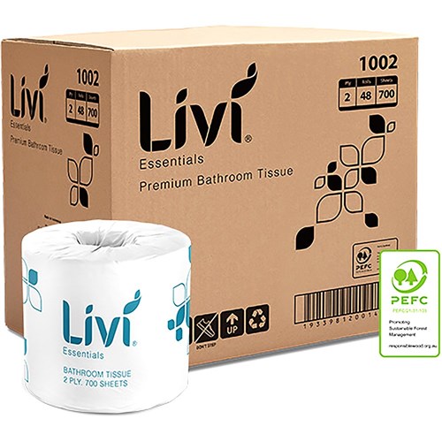 A quality solution that delivers a soft and absorbent toilet paper at an affordable price, with 700 sheets to minimise refills and run out. Designed for modern bathrooms where comfort and softness is valued, with each roll wrapped in stylish individual packing for improved hygiene and presentation. 100% sustainable virgin fibre that is independently certified annually by PEFC. To suit Livi toilet dispenser 5500, 5501 and 5502.