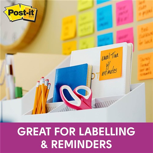 Repositionable adhesive wont leave marks on paper or other surfaces. Bright colours make your message stand out, convey urgency and signify hot news. Great for short to-do lists and reminders. 24 pads per pack. All Post-it Notes are Recyclable.