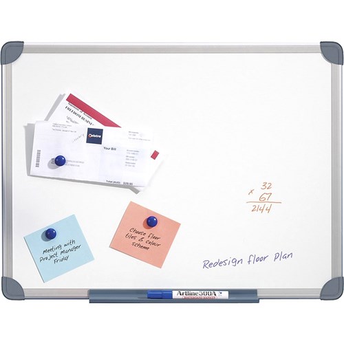 Slim design minimises protrusion from the wall. Contemporary aluminium frame for efficient use in any environment. High quality dry erase steel surface. Magnetic surface allows the board to be used as bulletin board. Includes pen tray, marker and wall mounting kit.