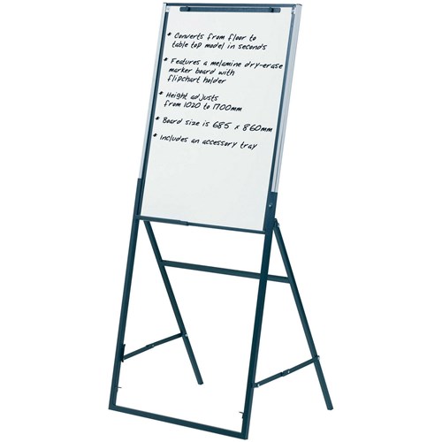 Combined whiteboard and flipchart easel in one. Easel height adjusts from 1020mm - 1700mm at the touch of a button but folds away for easy storage. Features lockable cross braces on the legs to ensure sturdiness. Board dimensions 685 x 860mm. Includes a flipchart holder. Lightweight black frame collapses to easily transport easel. Ideal for presentations and collaborations. Includes marker and built in accessory tray.