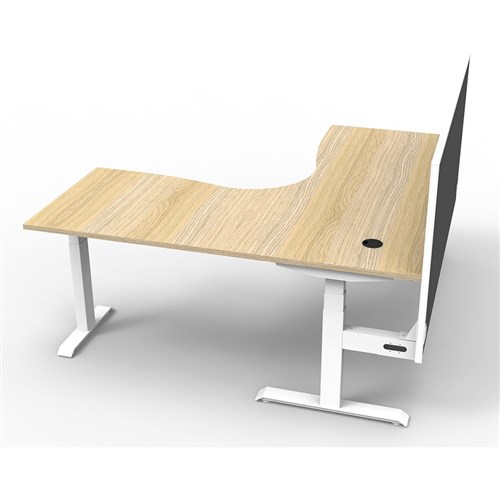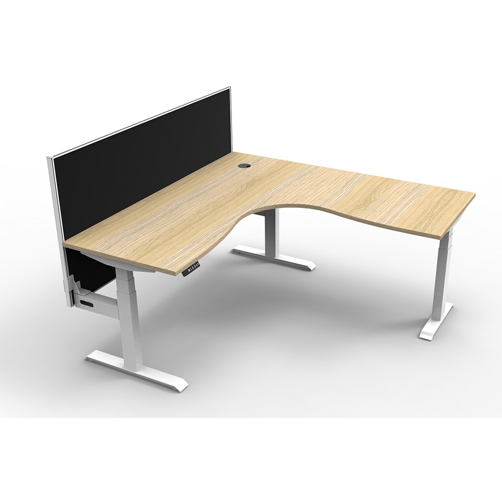 The entire Boost+ range has now been performance tested and is compliant to the AFRDI standards for general safety, strength, durability and stability in all sizes and configurations based on AS/NZS 4442:201. Unit Dimension:1800mm W x 1500mm W x 750mm D x 620mm - 1270mm H. Includes pinnable privacy screen in black fabric with matching white powder coated frame. 900mm H x 30mm T. Smooth and quiet adjustment at 38mm per second. Digital control panel with 3 pre-set positions, LED display panel, keypad safety lock and reminder alarm setting. Natural Oak coloured worksurface with 750mm depth top. 50mm D scallop cut out to rear. 140kg weight loading capacity. Dual Motor 3 stage motorised legs. Corner Workstation with Screen. 10 Year Manufacturer's Warranty. Delivery, installation and assembly charges may apply to furniture. Please enquire to confirm.