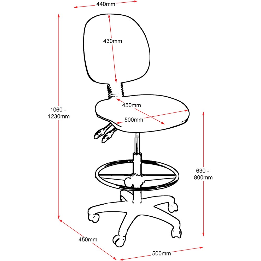 Medium back drafting chair with gas lift, back tilt, injection moulded foam. Foot ring. Semi ergonomic. 2 levers. Chair Dimensions: Seat 500W x 450D x Back 430H x Seat 630-800mmH. Weight Rating: 120 Kg. AFRDI approved at Level 6 for severe commercial use. 3 Year Manufacturer's Warranty.