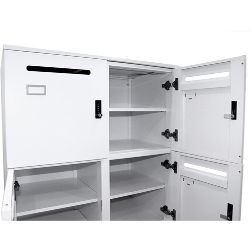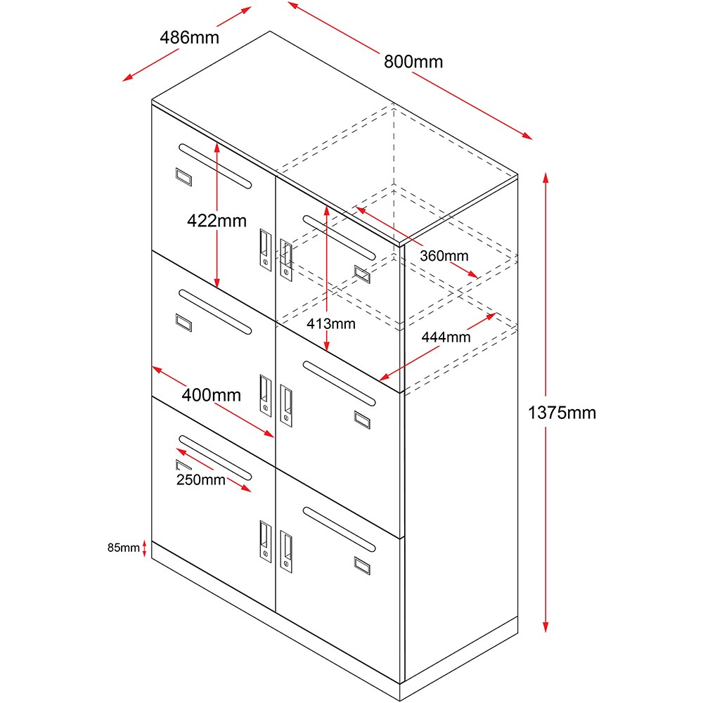 CATEGORY 1 WARNING: This product has a high risk of toppling over. Children have died from furniture tipover. ALWAYS secure this furniture with an anchor device. 6 lockable individual compartments. Mail or document slot and adjustable shelf. Name tag holder fitted to each door. Powder coated finish. 4 digit combination lock fitted to each door with both private and public functions. 1 x master key provided with each unit. Individual locker size 360W x 470D x 420mmH. Unit Dimension: 800W x 486D x 1375mmH. 10 Year Manufacturer's Warranty. Delivery, installation and assembly charges may apply to furniture. Please enquire to confirm.