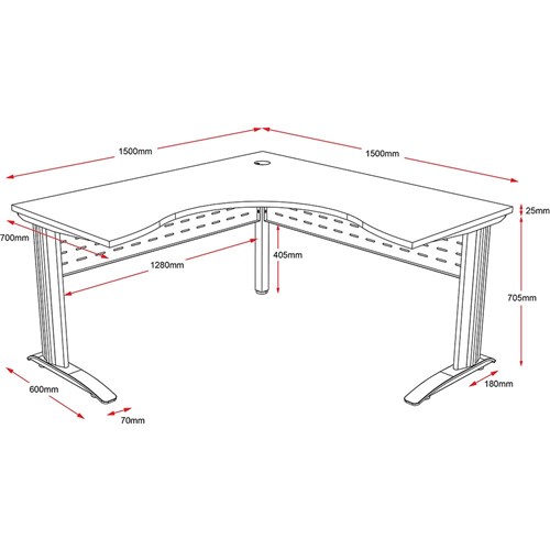 One piece corner workstation with 25mm top. Sturdy powder coated frame and legs. Comes with metal perforated modesty panel and cable tidy. E0 Enviroboard top. 1 x 80mm cable entry hole in corner of top. Adjustable feet. 5 Years Manufacturer's Warranty. Delivery, installation and assembly charges may apply to furniture. Please enquire to confirm.