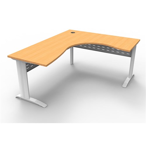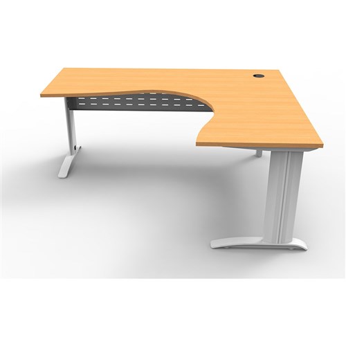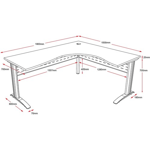 One piece corner workstation with 25mm top. Sturdy powder coated frame and legs. Comes with metal perforated modesty panel and cable tidy. E0 Enviroboard top. 1 x 80mm cable entry hole in corner of top. Adjustable feet. 5 Years Manufacturer's Warranty. Delivery, installation and assembly charges may apply to furniture. Please enquire to confirm.
