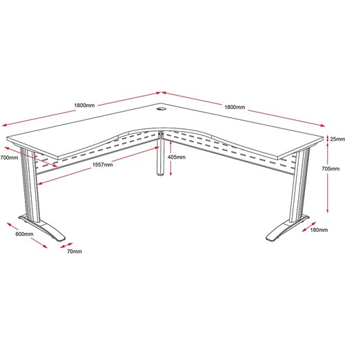 One piece corner workstation with 25mm top. Sturdy powder coated frame and legs. Comes with metal perforated modesty panel and cable tidy. E0 Enviroboard top. 1 x 80mm cable entry hole in corner of top. Adjustable feet. 5 Years Manufacturer's Warranty. Delivery, installation and assembly charges may apply to furniture. Please enquire to confirm.