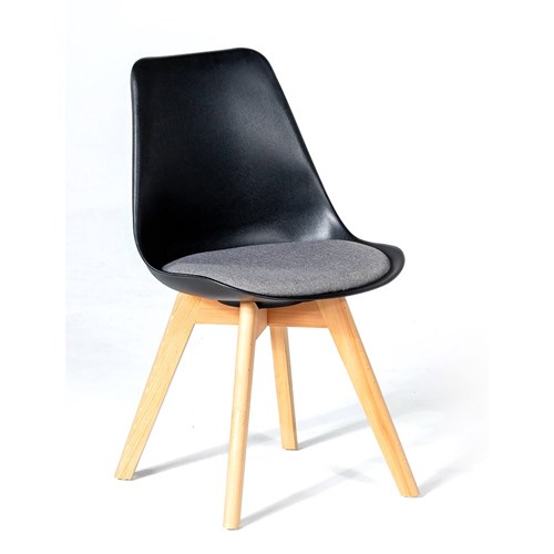 Black shell and grey pad. Polypropylene shell. Solid timber legs. Soft upholstered seat pad Great for Breakout and Collaboration spaces. Chair Dimensions: 440W x 440D x 825mmH. Seat Height 470mm. 3 Year Manufacturer's Warranty. Delivery, installation and assembly charges may apply to furniture. Please enquire to confirm.