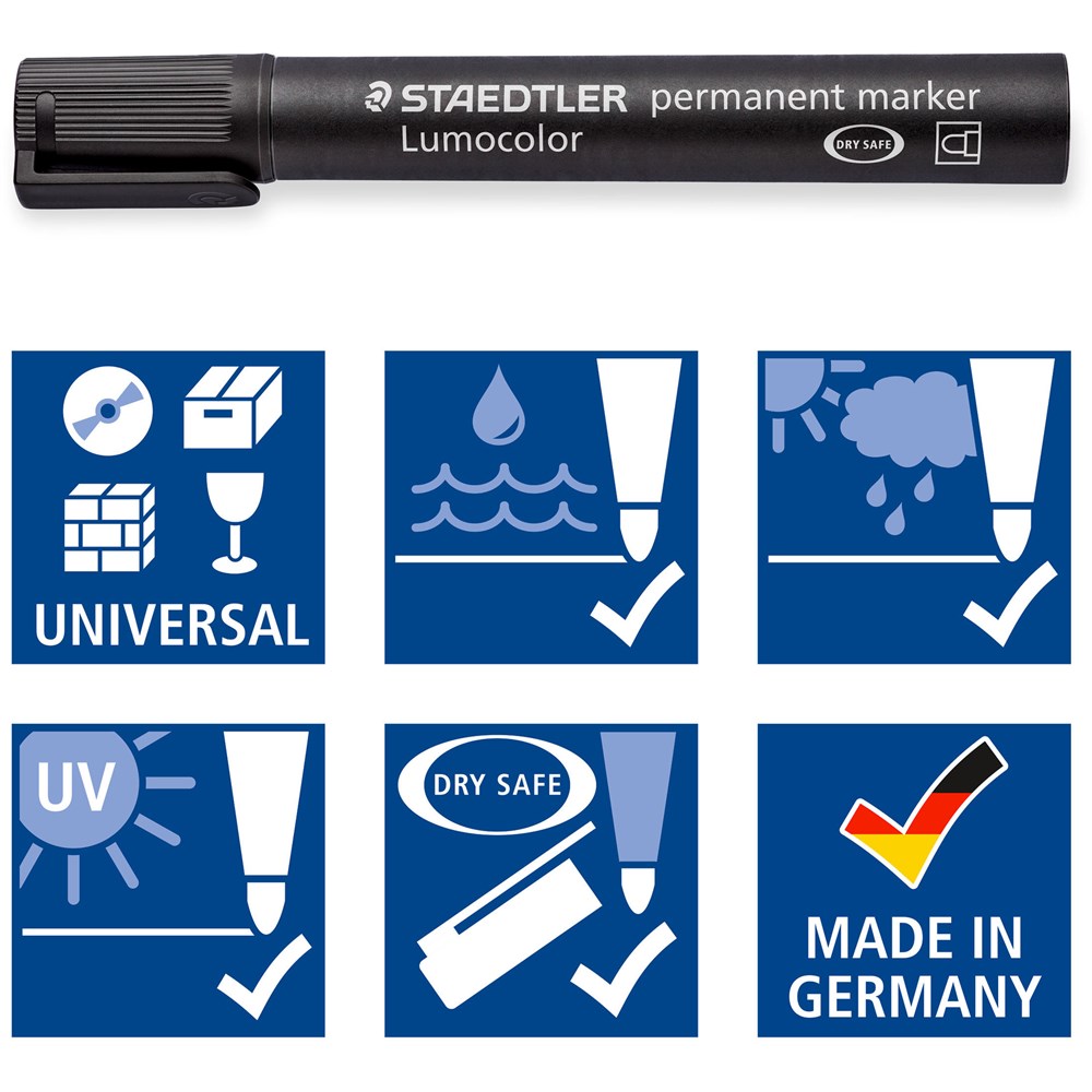 Excellent smudge-proof and waterproof qualities on almost all surfaces. Dries in seconds, therefore ideal for left-handed users. Colour intensive, low-odour and lightfast. DrySafe ink can be left uncapped for days without drying up. Bullet tip with line width 2.0mm. Available in boxes of 10 in red, blue, black, green, orange & violet, wallets of 4 & 8 assorted colours. Cup of 19 markers in black or assorted: 2x red, 2x blue, 2x green, 2x orange, 2x violet & 9x black. Wallets convert into convenient desk stands.