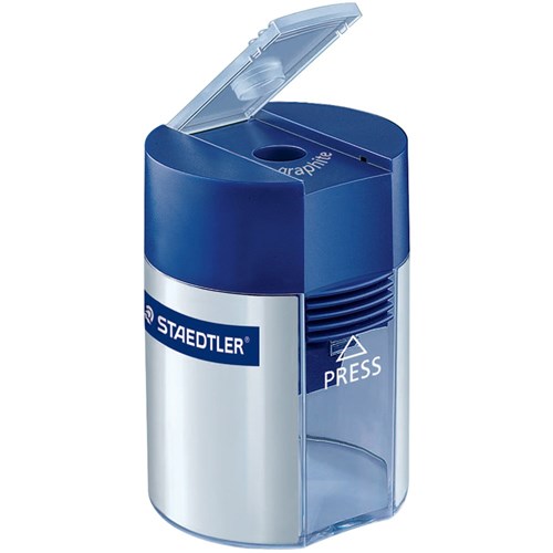 Ergonomically designed. Features metal sharpener with special cut out for effortless removal of broken leads. Hinged cover on lid. For graphite and coloured pencils including maxi and triangular.
